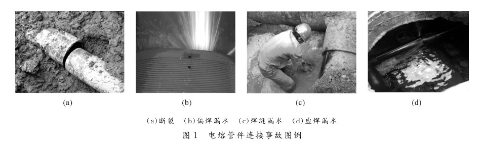 電熔管件生產(chǎn)技術(shù)相對復雜,因此產(chǎn)品品質(zhì)有較大區(qū)別。在連接施工過程中,受環(huán)境、人員技能、焊接設(shè)備、材料、管件結(jié)構(gòu)及工藝參數(shù)的影響,電熔管件焊接品質(zhì)控制難度較大,安裝不好易發(fā)生電熔管件連接的虛焊、偏焊、過焊、斷絲等事故,進而可能出現(xiàn)管 道 連 接 的 斷 裂、焊 縫 漏 水 等 品 質(zhì) 問 題,見圖 。
