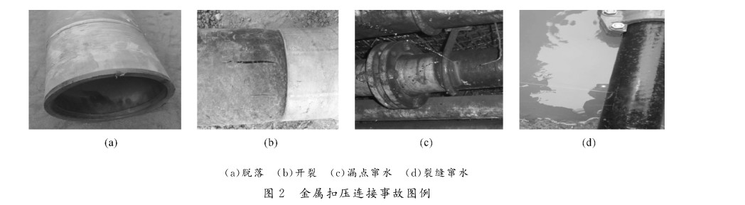 鋼絲網(wǎng)骨架聚乙烯復合管采用金屬扣壓連接可以滿足3.5MPa以內(nèi)的連接技術(shù)要求。但這種連接在承壓能力較高時,長期穩(wěn)定性較差,易發(fā)生管道系統(tǒng)金屬扣壓接頭脫落、竄水、竄氣等問題,見圖2。