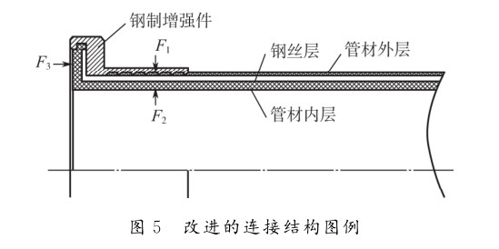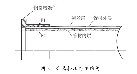 1.6MPa時,通常使用金屬扣壓連接。在常規(guī)的金屬扣壓連接中,復合管中鋼絲與鋼制增強件之間的連接,靠的是鋼制增強件與復合管材內(nèi)壁之間夾持力F1及F2,如圖3所示。