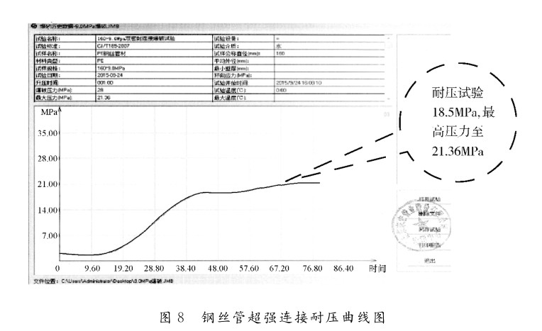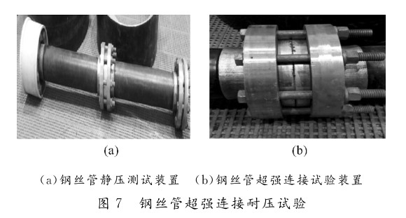 (2)根據(jù)對鋼絲管超強連接實驗結(jié)果表明,將鋼絲管連接端部的鋼絲固定,致使鋼絲管在承壓時不被抽動,有效地解決了鋼絲管材中鋼絲的連接的問題;經(jīng)過耐壓試驗達到21.36MPa,表明鋼絲管這種超強連接技術(shù)是可行的;
